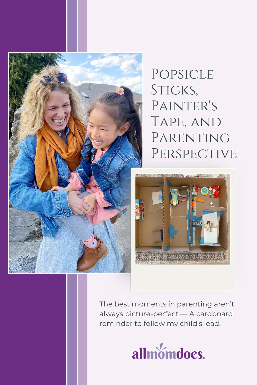 So I scrapped all my grand social media ideas, and together we found old cardboard boxes, painters tape, scraps of fabric, and popsicle sticks. Penny instructed me on what she wanted to build, and together over the course of 2 hours we made a house, bunk beds, a kitchen sink, toilet, refrigerator, and stairs.